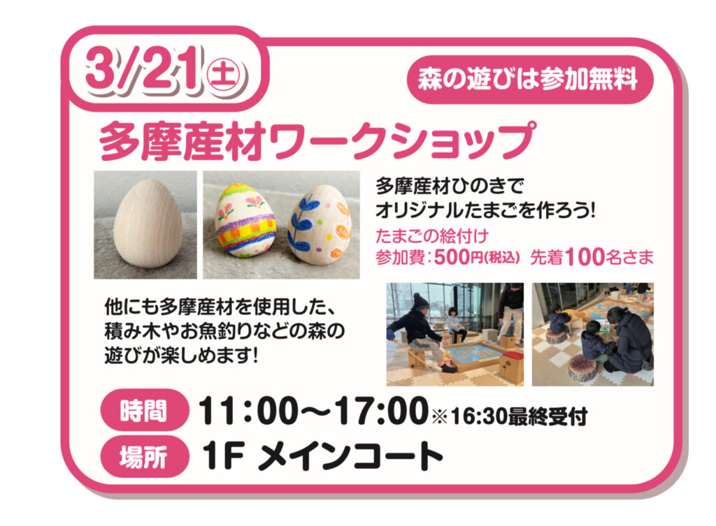 3/21(土)「イオンモール日の出」にてワークショップ&森のあそび場の運営を致します!ワークショップについてはヒノキのたまごに絵やスタンプで色をつけて、キラキラなどを貼ってオリジナルのたまごを作って頂きます。100名限定なのでお早めにご来場ください。